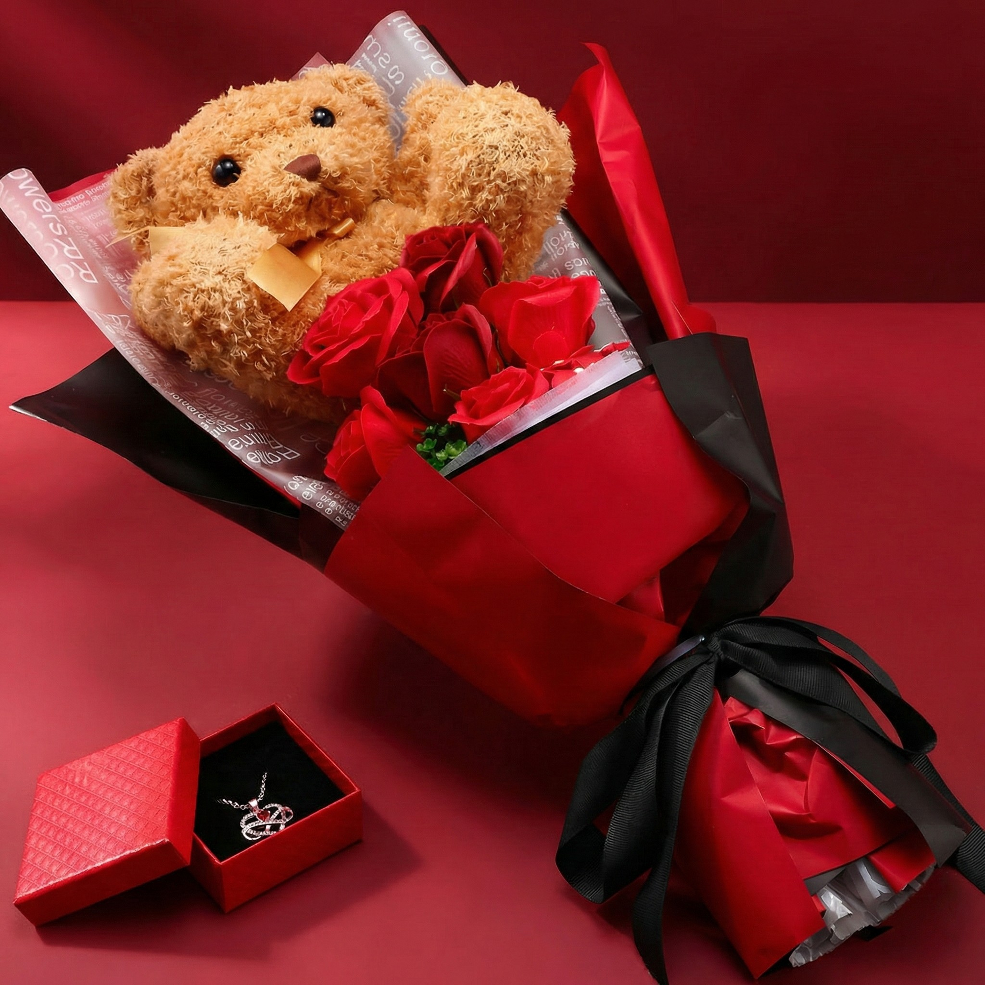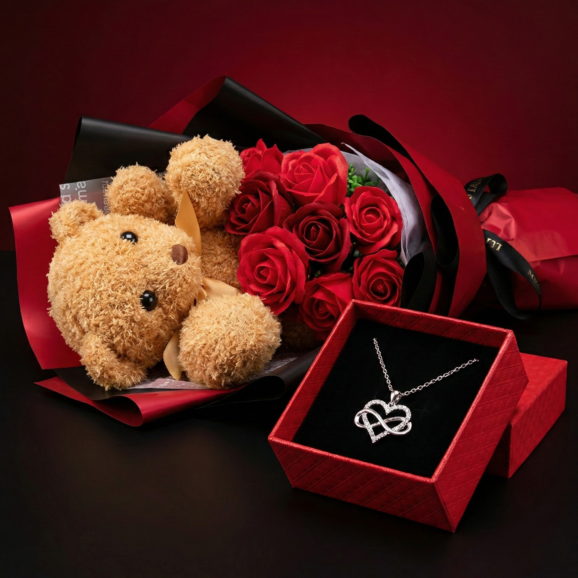 Ovaj poklon nije samo prelep, već nosi i snažnu simboliku ljubavi i povezanosti. Medvedić predstavlja nežnost, ruže simbolizuju večnu ljubav, dok ogrlica dodaje notu romantike. Sve zajedno, ovaj set stvara poklon koji se pamti.