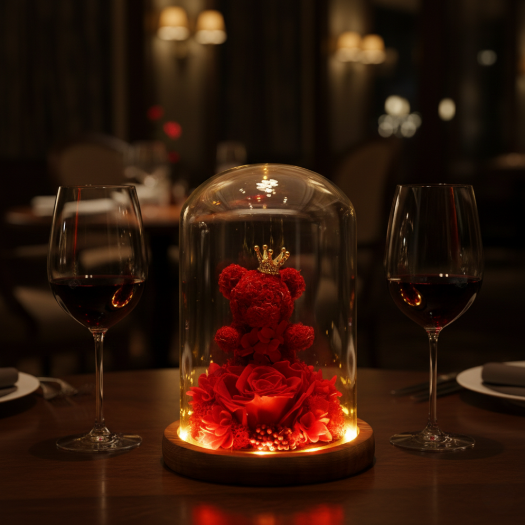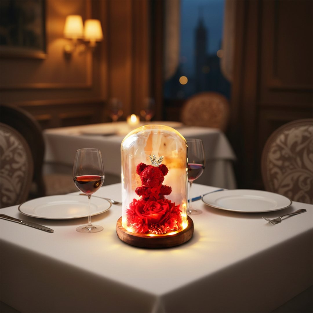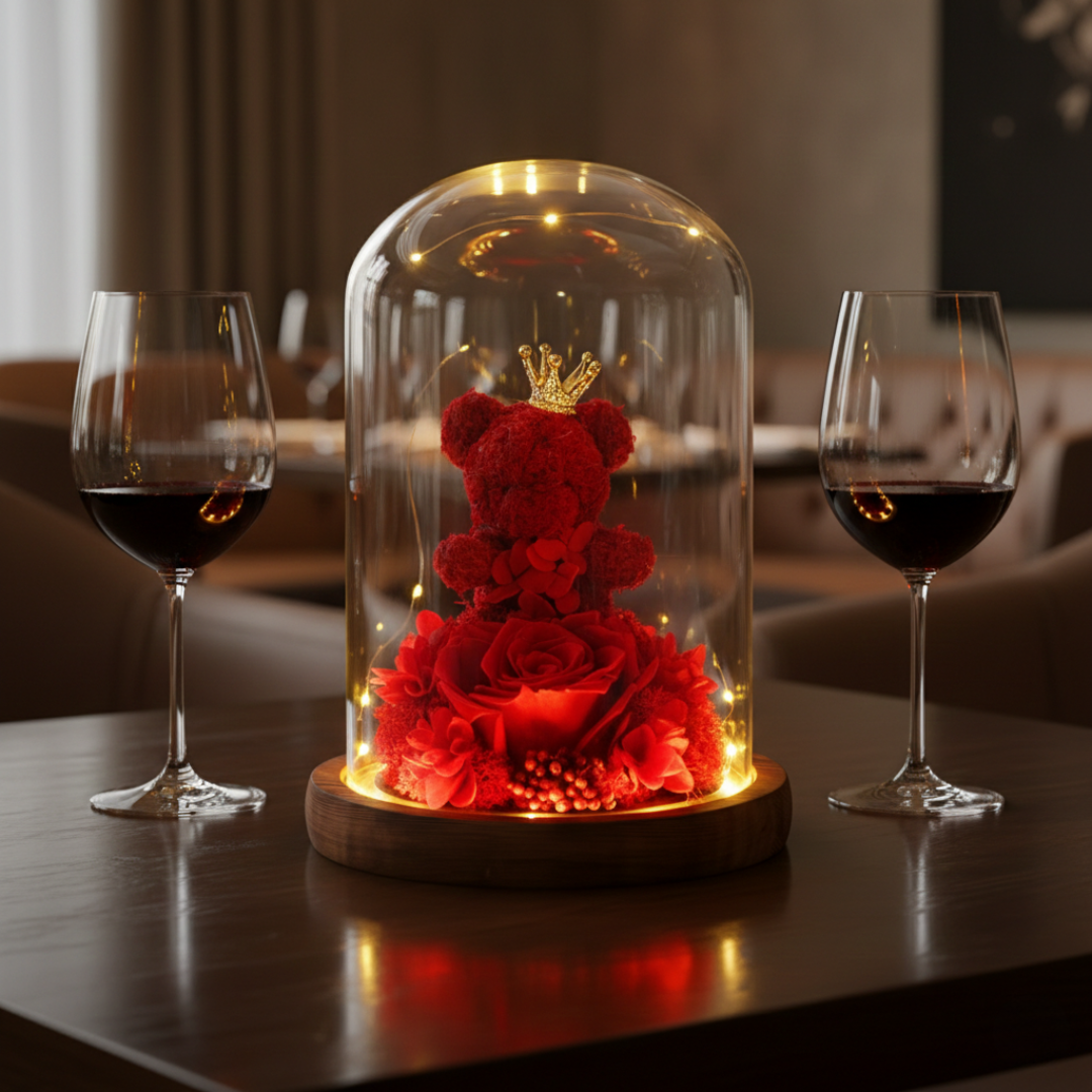 Uz diskretna LED svetla, medvedić i ruža u staklenom zvonu stvaraju toplu i romantičnu atmosferu. Savršeno se uklapaju u svaki prostor – bilo da ih postavite u spavaću sobu, dnevni boravak ili na sto tokom večere, njihova nežna svetlost unosi osećaj topline i elegancije.