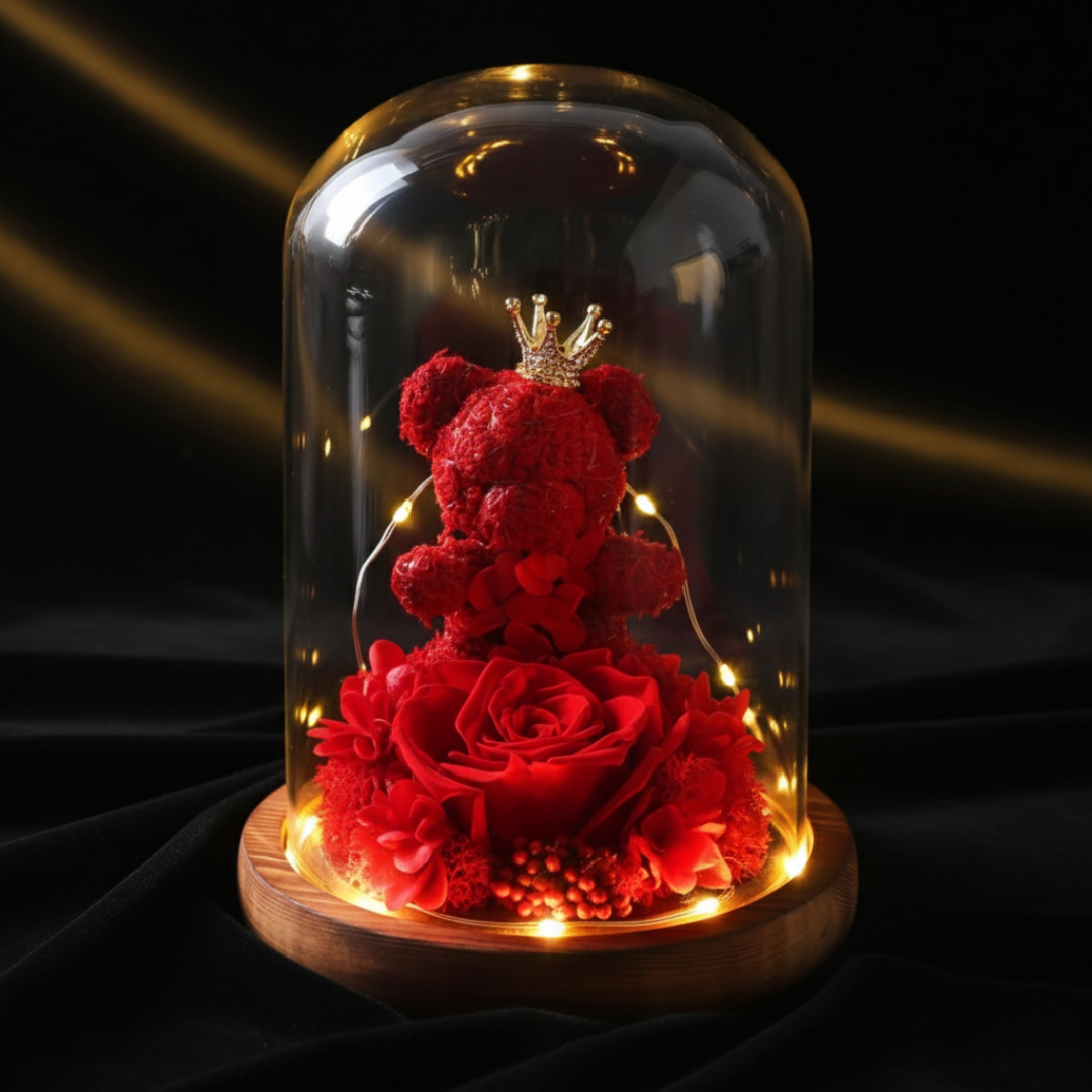 Mangov elegantan spoj medvedića izrađenog od ruža i prelepe crvene ruže u osvetljenoj staklenoj kupoli stvara magičan i romantičan ambijent, savršen za svaku posebnu priliku.