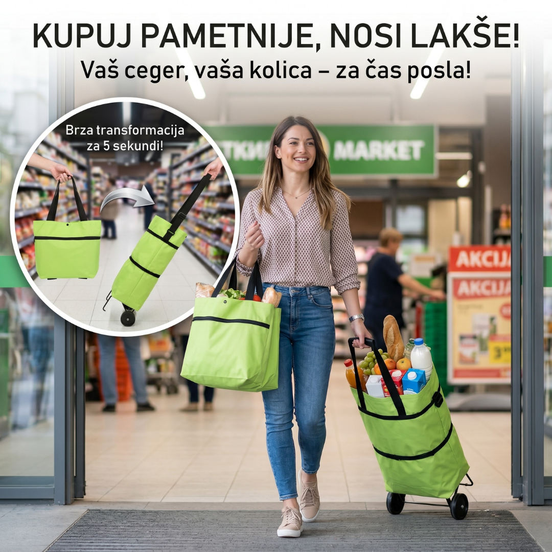 Ova jedinstvena kombinacija cegera i kolica nudi savršeno rešenje za sve koji su umorni od pretrpanih ruku i stalnog trošenja novca na plastične kese.