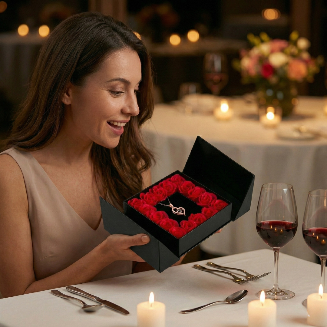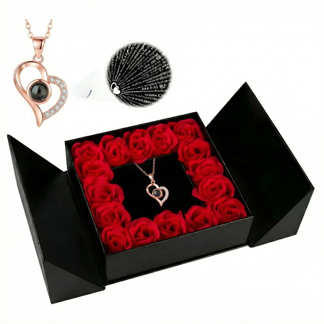 Ogrlica 'Volim te na 100 jezika' u luksuznoj poklon kutiji sa ružama
