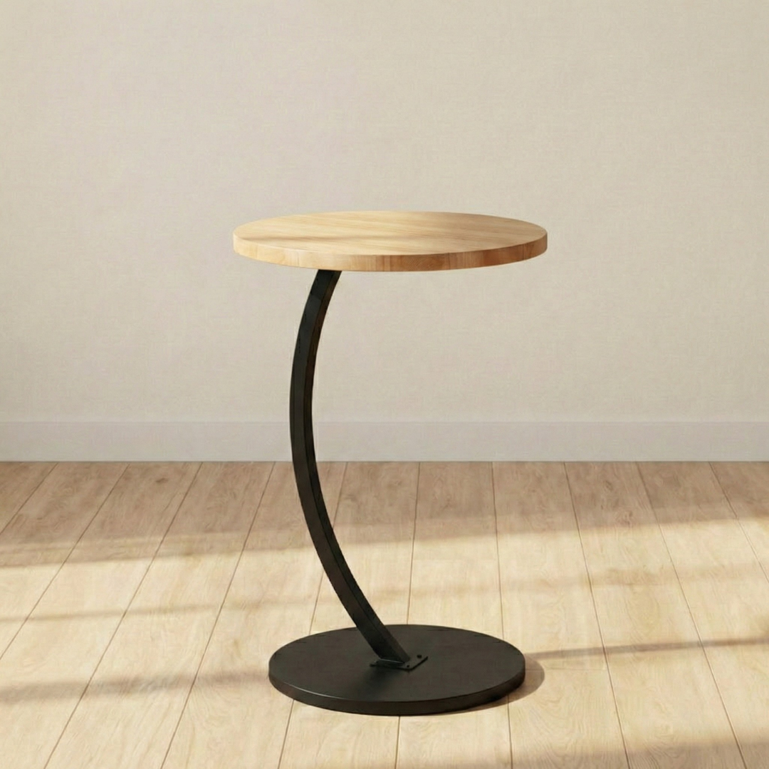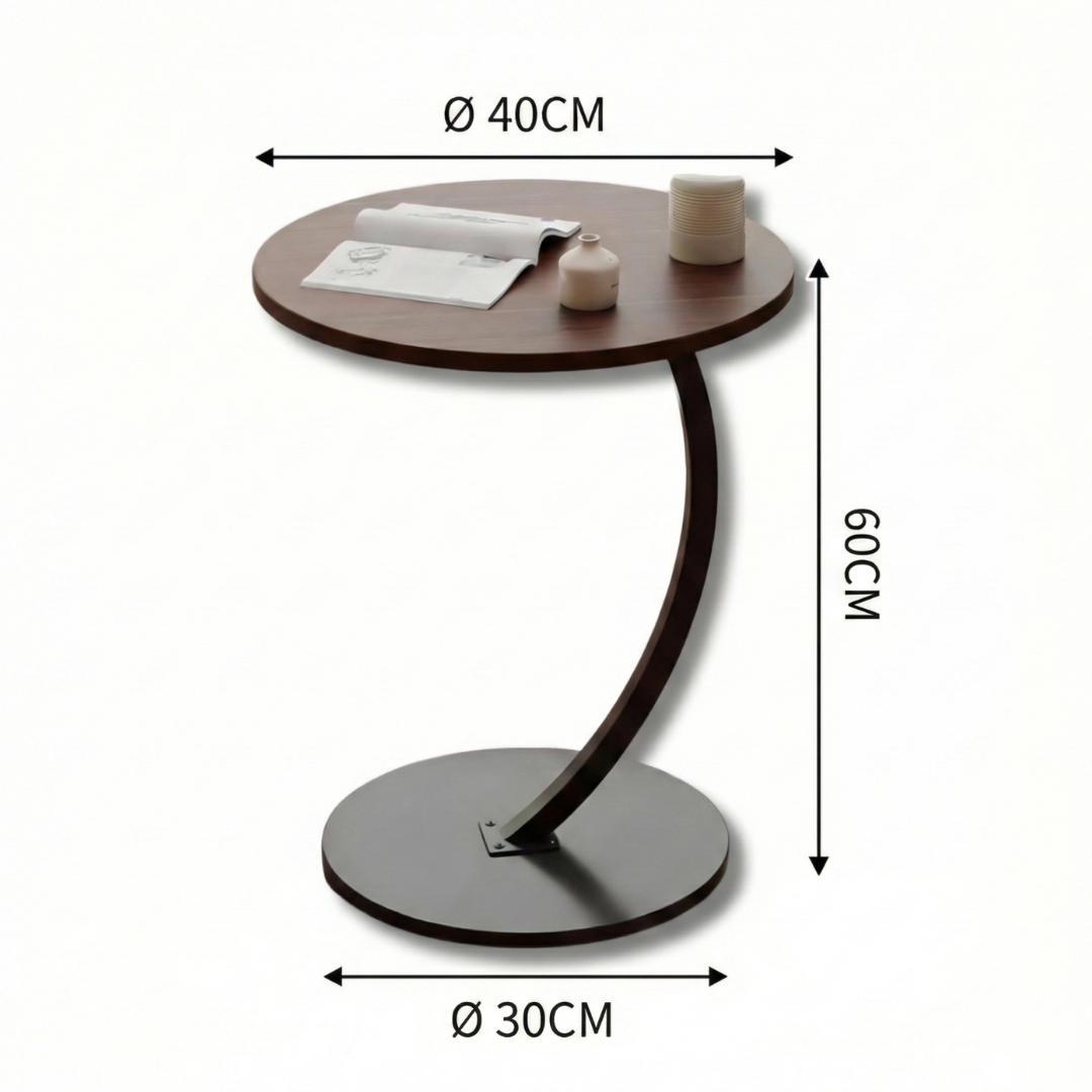 Napravljen od čvrste metalne osnove i kvalitetne drvene ploče prečnika 40 cm, stočić pruža stabilnost i čvrstoću, dok zaobljeni C okvir omogućava da ga lako približite krevetu ili sofi. Visina od 60 cm savršeno odgovara visini sedišta, dok osnovna ploča prečnika 30 cm obezbeđuje stabilnost čak i na neravnim površinama.