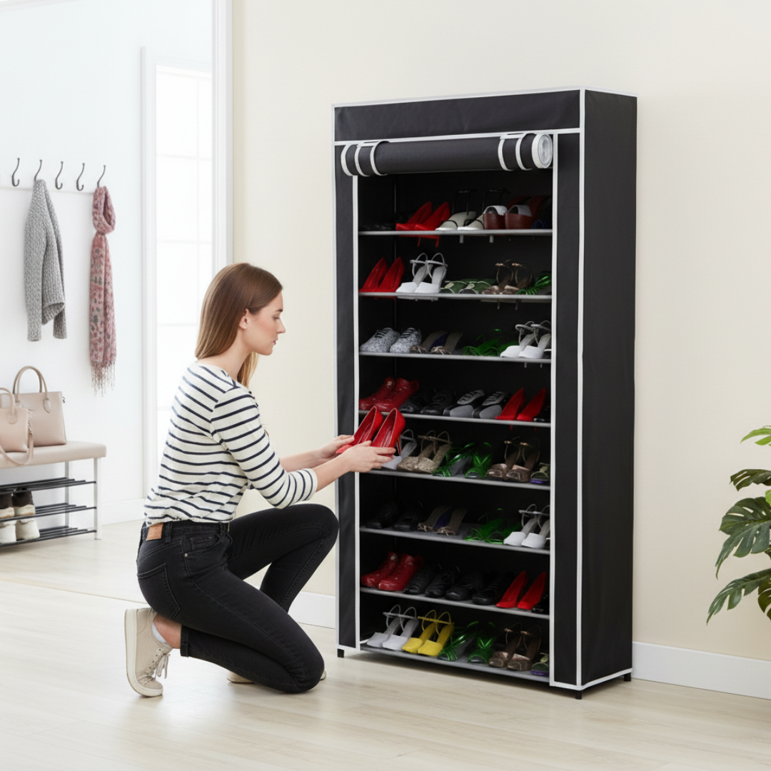 Bilo da ga smestite u hodnik, ormar, spavaću sobu ili čak garažu, ovaj stalak za cipele idealno koristi prostor. Njegova elegantna crna boja i jednostavan dizajn čine ga savršenim dodatkom svakom enterijeru. Ne samo da štedi prostor, već i olakšava organizaciju, pomažući vam da uvek pronađete par cipela koji vam je potreban.