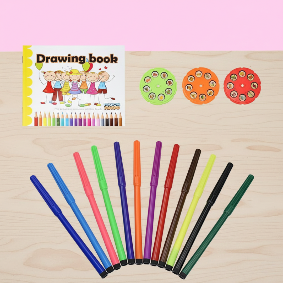 U setu dolaze stočić, projektor, slajdovi sa motivima i pribor za crtanje, tako da dete može odmah da počne sa igrom. Nema dodatne kupovine, sve što je potrebno je već u paketu.